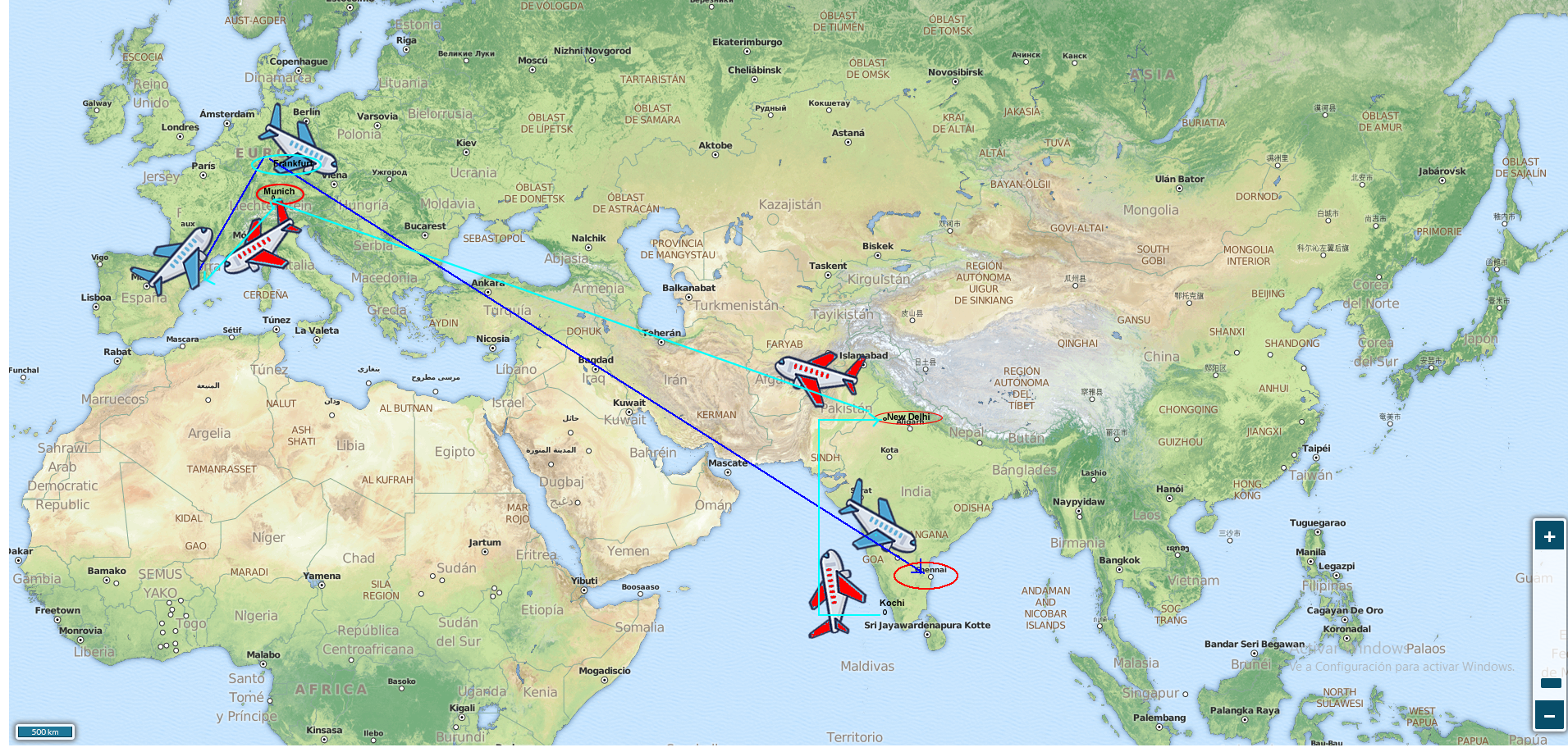 Els avionets blaus del mapa són els d’anada i els vermells de tornada.